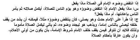 Si un évènement survient à l’imâm pendant la prière, comme la rupture de ses ablutions par exemple, il peut avancer l’une des personnes qui prient derrière lui pour le remplacer en tant qu’imâm. Il ira alors renouveler ses ablutions puis il retournera prier avec le groupe derrière l’imâm suppléant. C’est pourquoi il est indispensable que celui qui prie immédiatement derriere l’imâm remplisse les conditions requise pour dirigier la prière, à savoir : être pubère et connaître les règles à observer pour la validité de la prière.